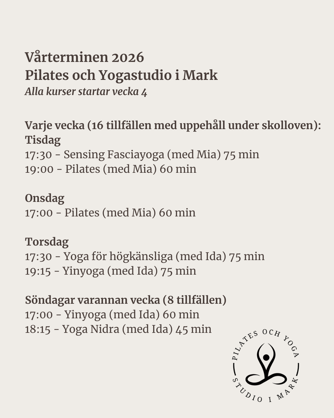 I vår mysiga studio erbjuder vi pilates- och yogaklasser i mindre grupper. I en harmonisk miljö får du utrymme att landa i dig själv och återhämta dig.